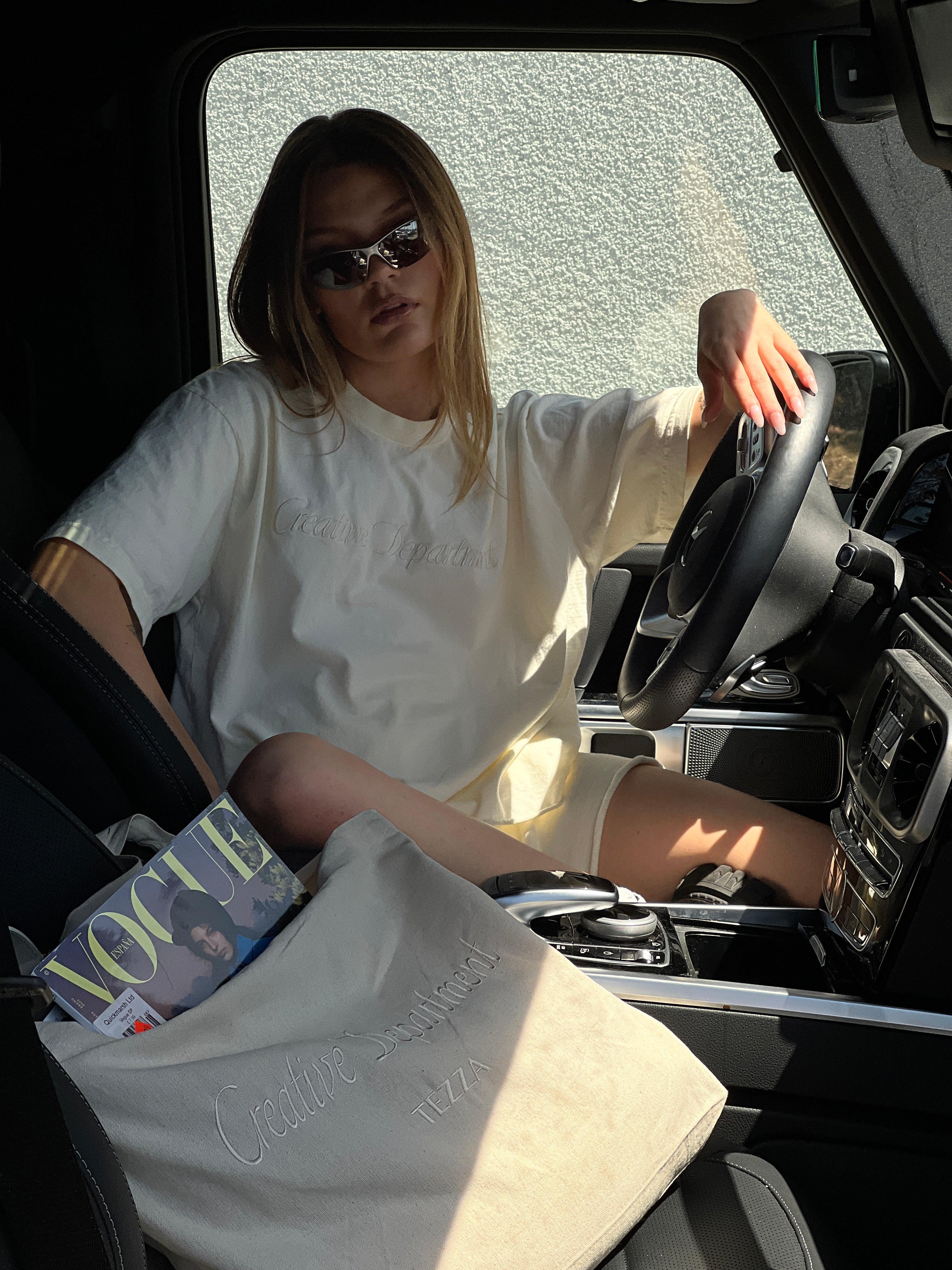 - Canvas tote with a light cream embroidered Creative Department logo.